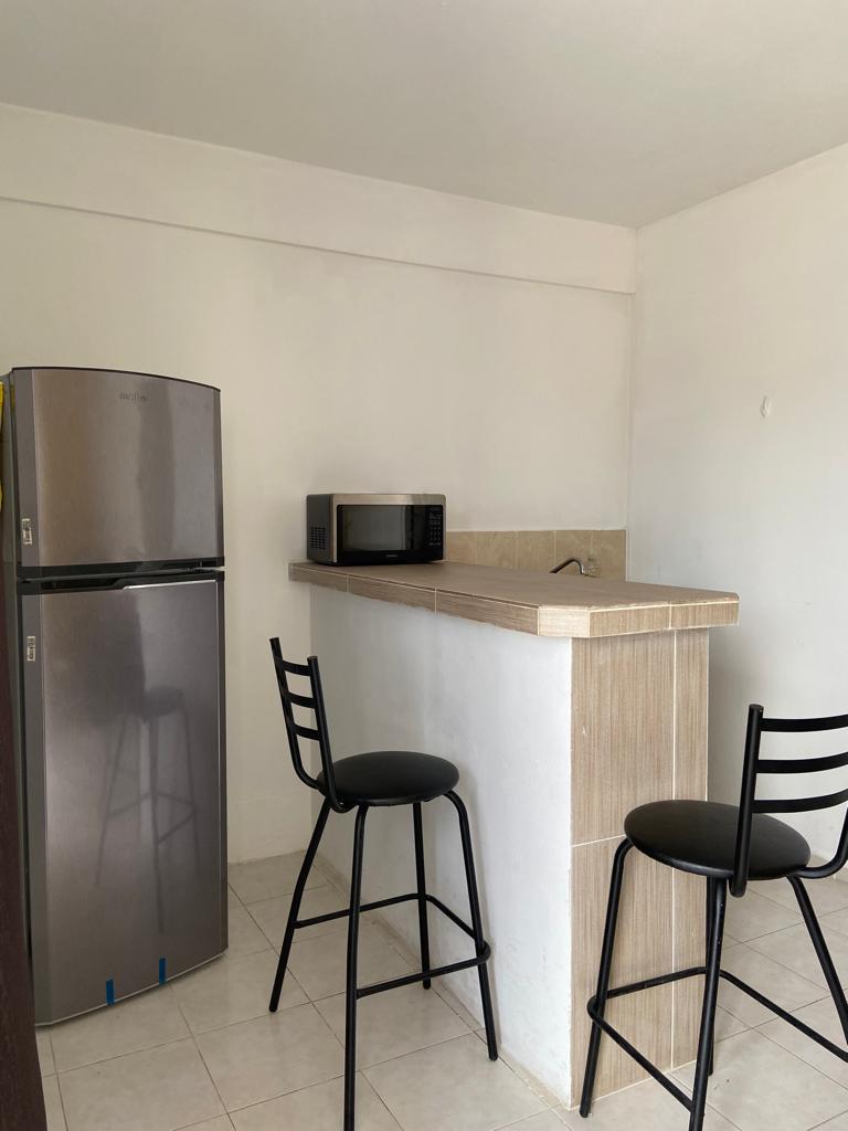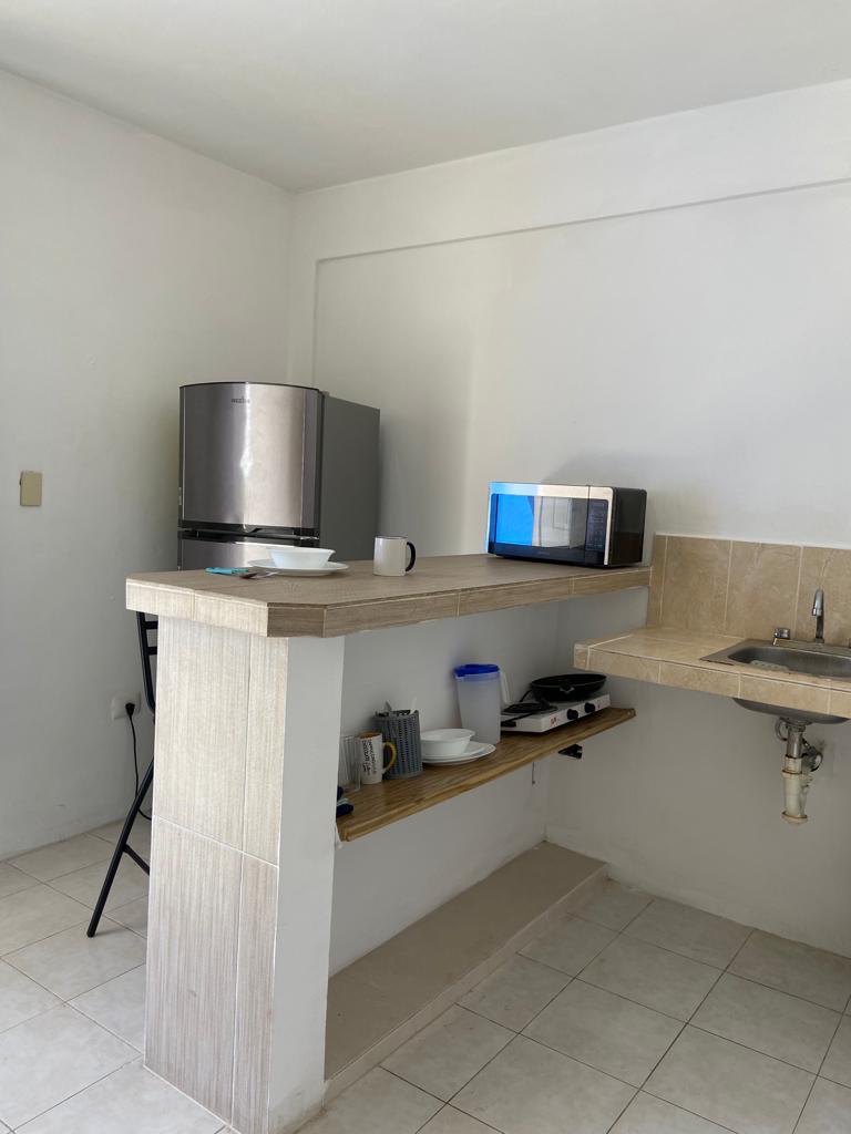 1 recámara con 2 camas individuales, baño completo closet, amaqueros, ventilador, aire acondicionado, cocineta con parrilla eléctrica de 2 hornillas , refrigerador, horno de microondas, set de vajilla para 2 personas.