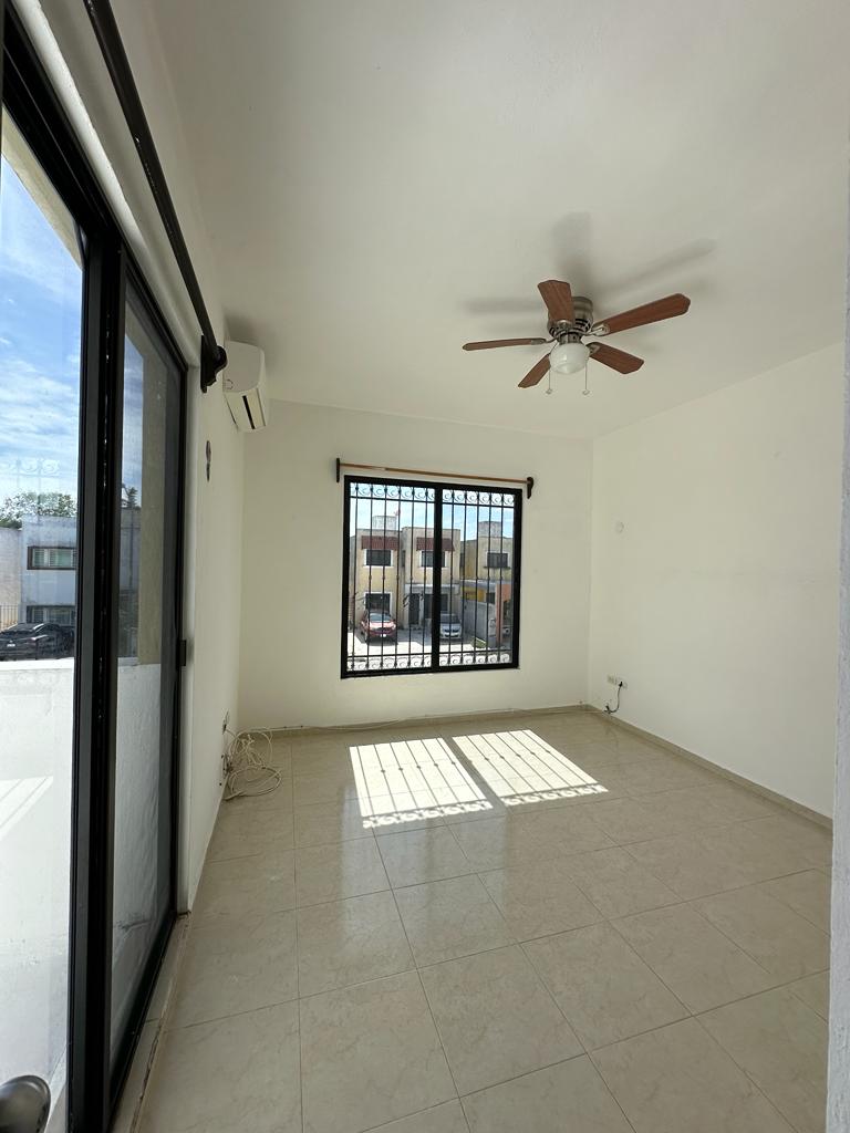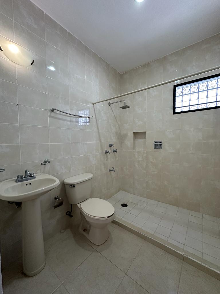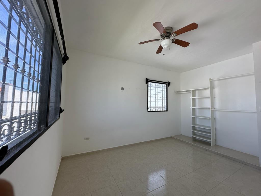 Recamara secundaria, con closet abierto y ventilador, baño completo que comparten las 2 habitaciones.