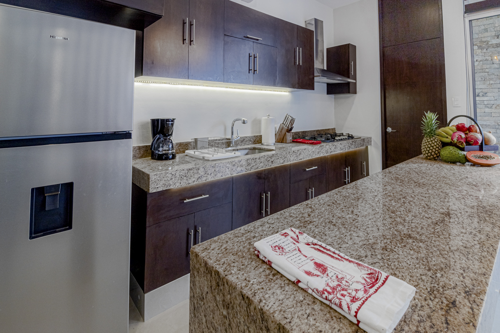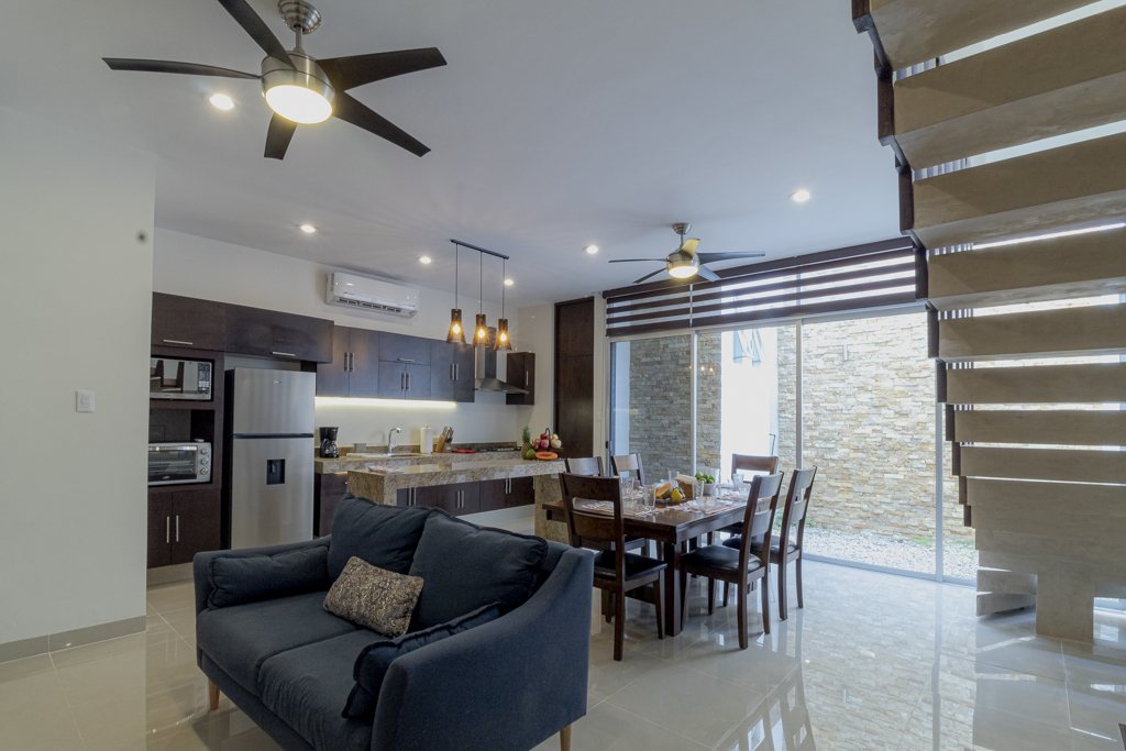Planta Baja: Salón central de sala-comedor corridos, Cocina integral con gavetas altas y bajas en madera, manerales de monomando, estufa de cuatro parrillas de gas. Barra desayunadora con cubierta de granito. Baño de de visitas. Cuarto de lavado con instalaciones para lavadora y secadora, Cochera techada para 2 autos.