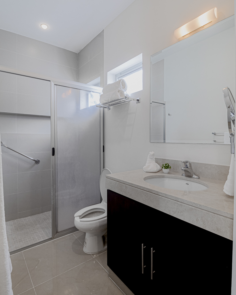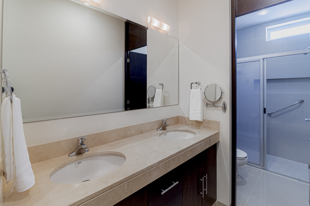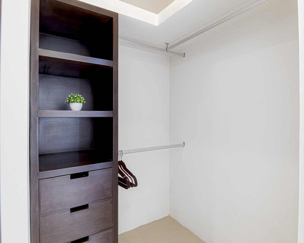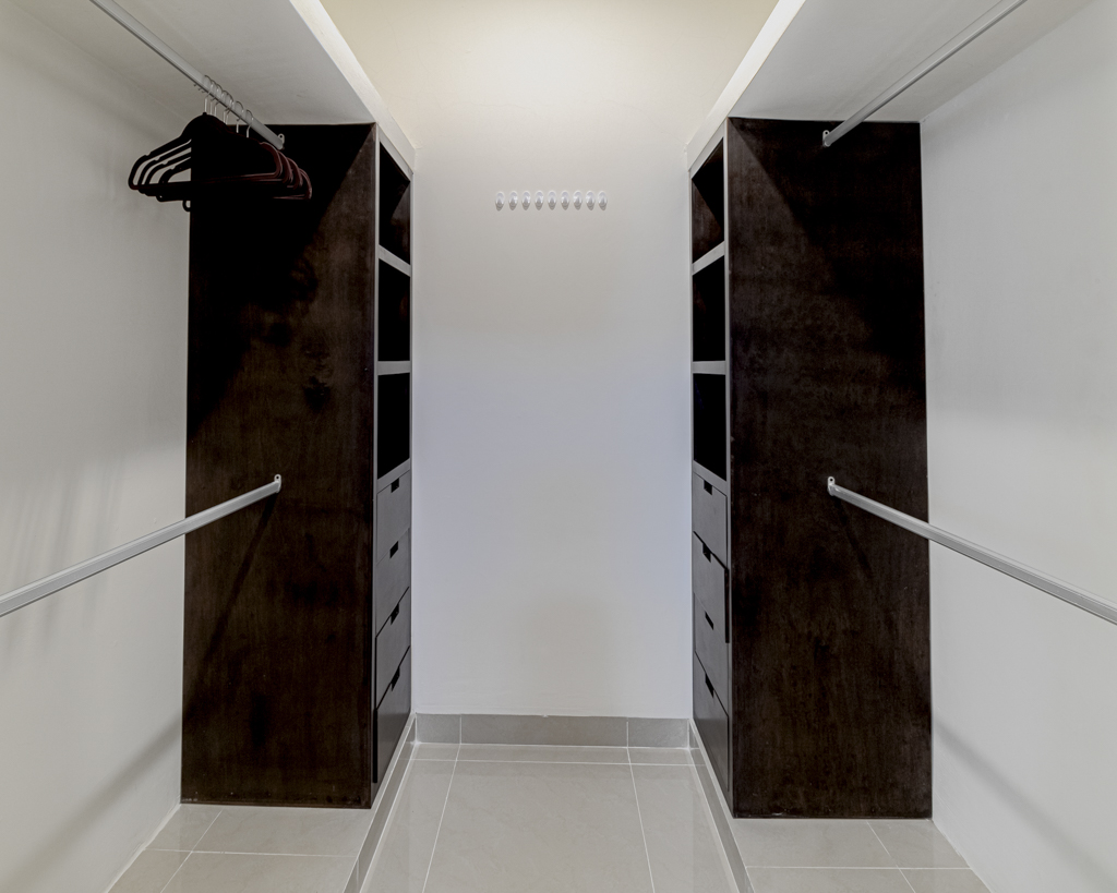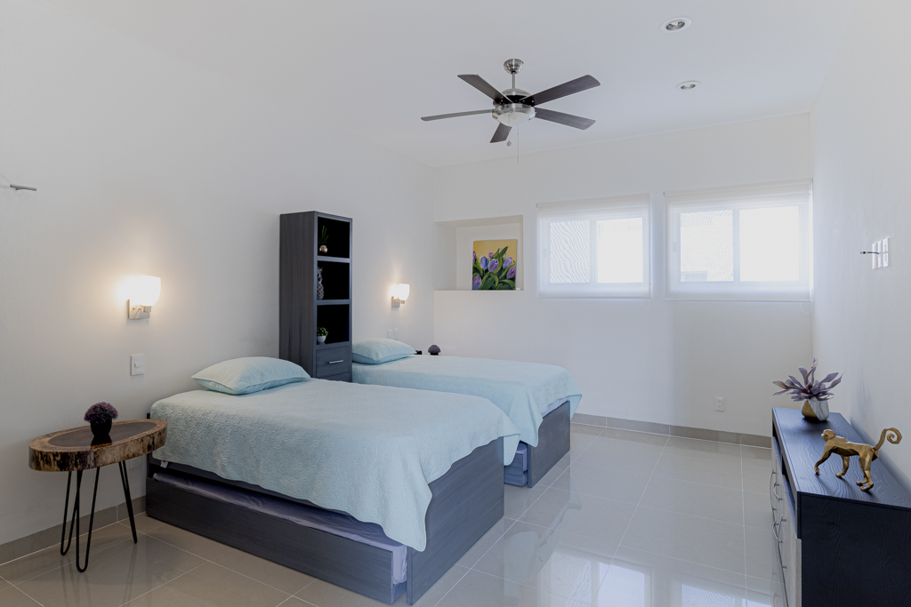 Planta Alta: 2 recamaras, ambas con closet tipo vestidor y baño completo, equipadas con aires acondicionados, ventiladores y persianas. Pasillo distribuidor con closet de blancos.
